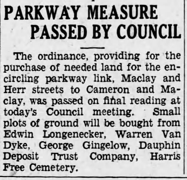 At today’s council meeting purchase of land needed for the encircling parkway link, Maclay and Herr streets to Cameron and Maclay…Small plots of ground will be bought from…Harris Free Cemetery.